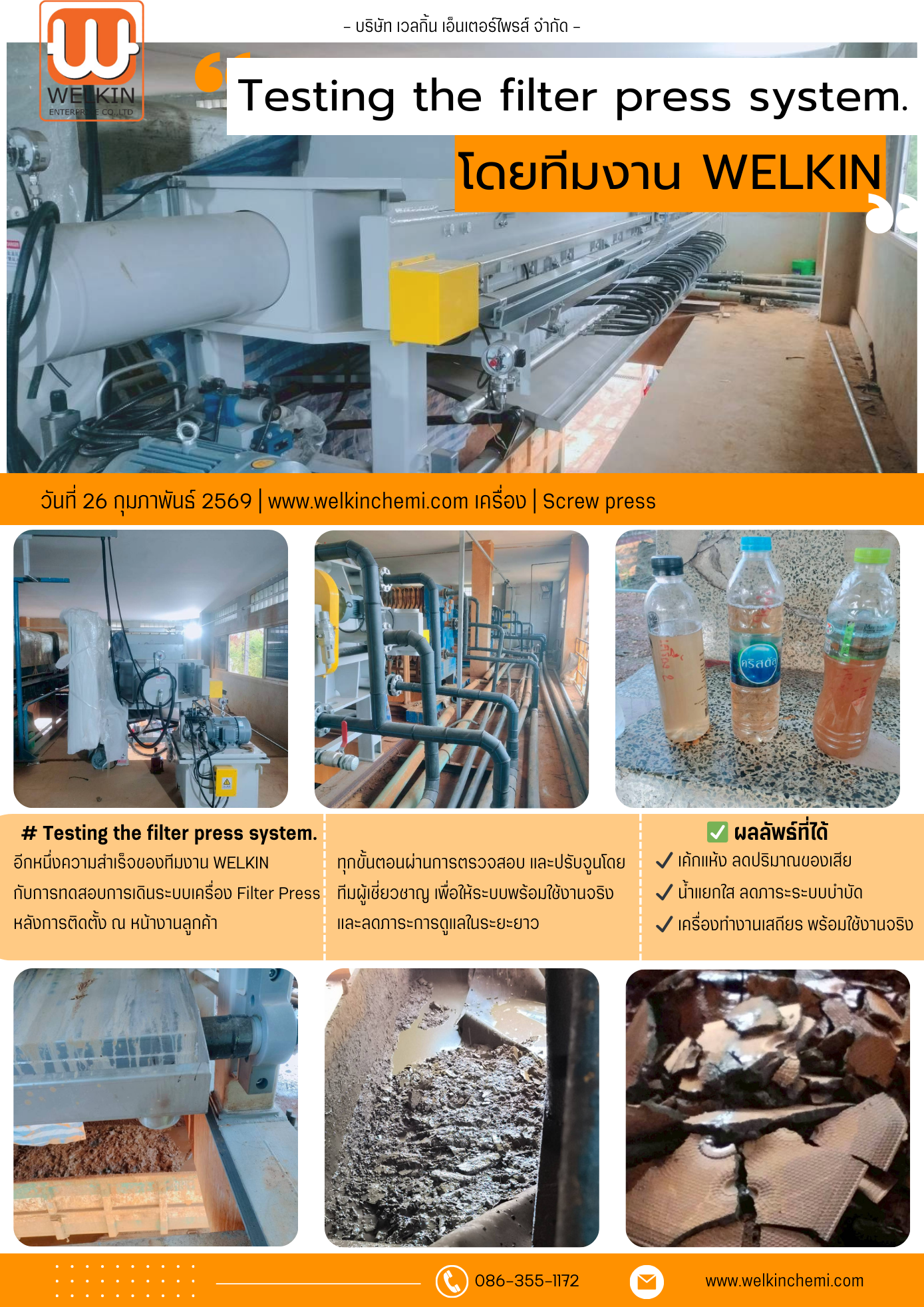 บริษัท เวลกิ้น เอ็นเตอร์ไพรส์ จำกัด ได้ดำเนินการทดสอบการเดินระบบเครื่อง Filter Press ภายหลังการติดตั้ง ณ หน้างานของลูกค้า เพื่อยืนยันประสิทธิภาพการทำงาน ความพร้อมของอุปกรณ์ และความเสถียรของระบบก่อนส่งมอบใช้งานจริง