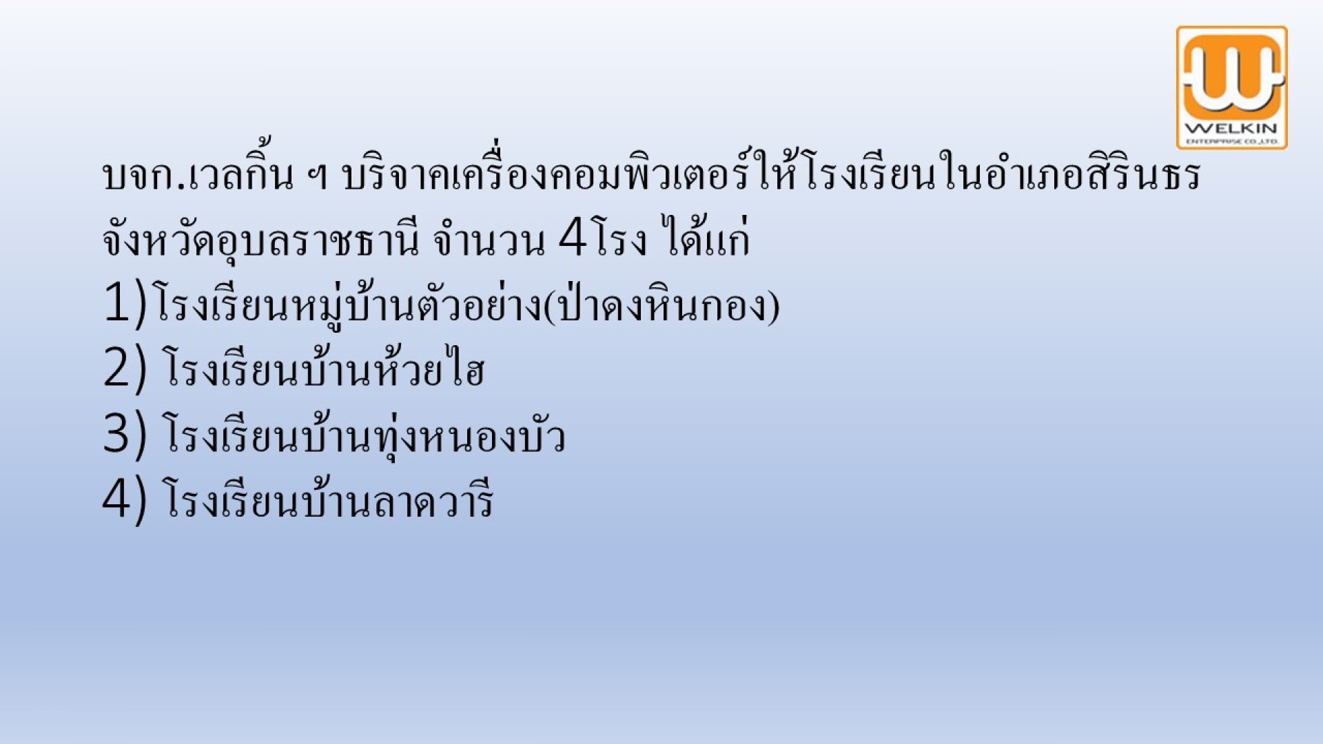บจก.เวลกิ้น เอ็นเตอร์ไพรส์ สนับสนุนบริจาคเครื่องพีซี ให้แก่โรงเรียน 4แห่งในอำเภอสิรินธร จ.อุบลราชธานี