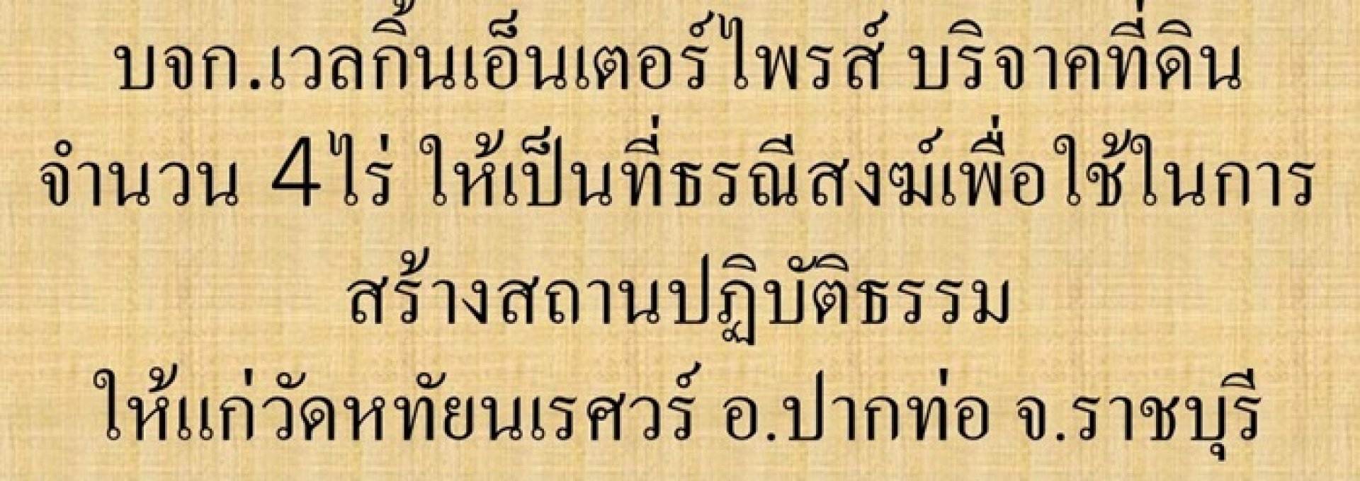 บจก.เวลกิ้นเอ็นเตอร์ไพรส์ บริจาคที่ดินจำนวน 4ไร่ ให้เป็นที่ธรณีสงฆ์เพื่อใช้ในการสร้างสถานปฏิบัติธรรม ให้แก่วัดหทัยนเรศวร์ อ.ปากท่อ จ.ราชบุรี